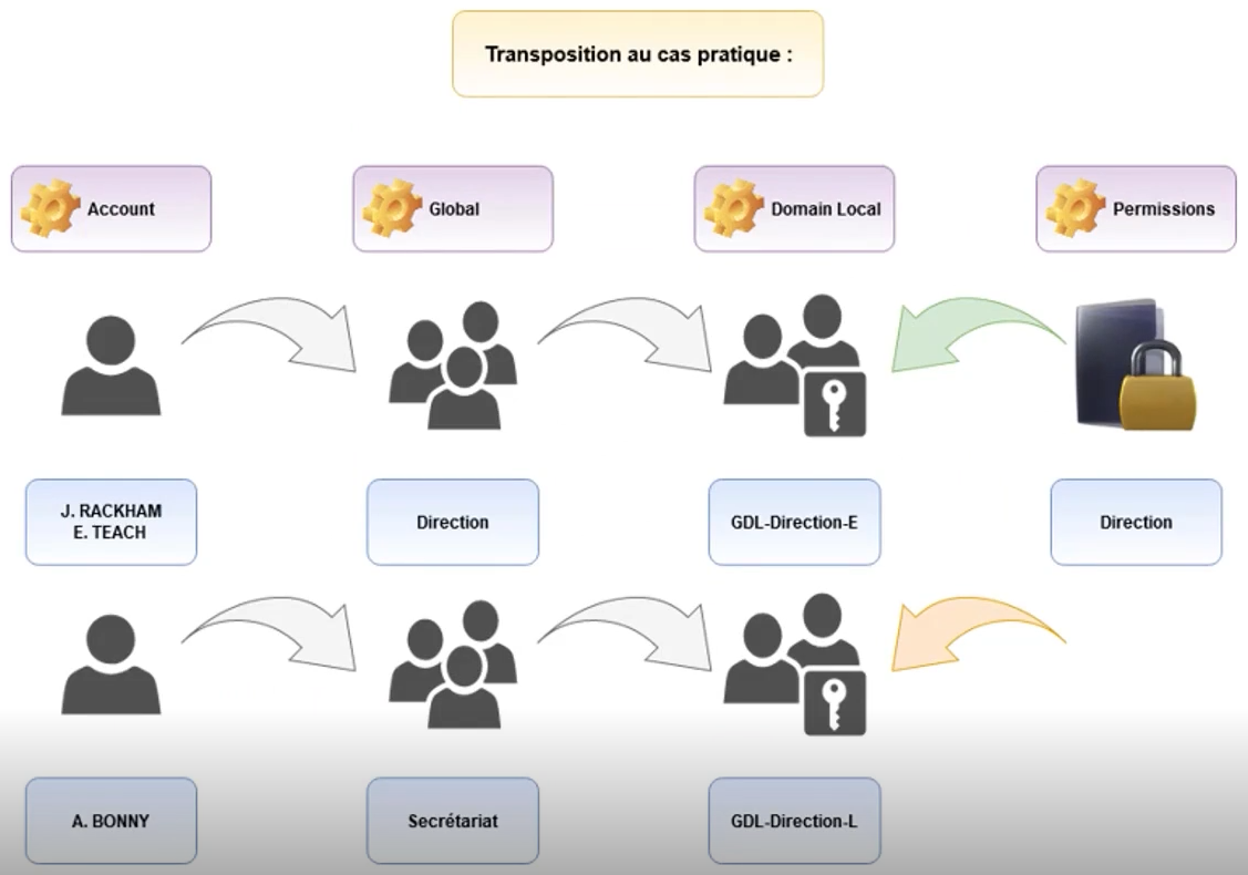 - C'est sur ce Groupe de Domaine Local (DL) que l'on va donner des Permissions (P)