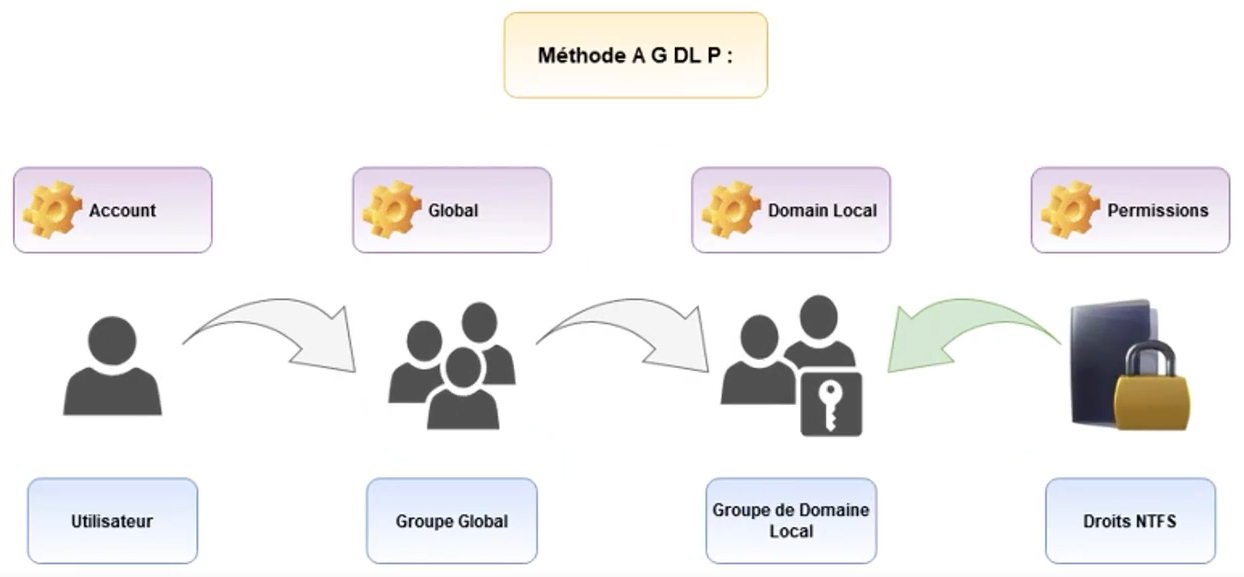 - AGDLP : Account, Global, Domain Local, Permission soit Compte, global, domaine local, autorisation.